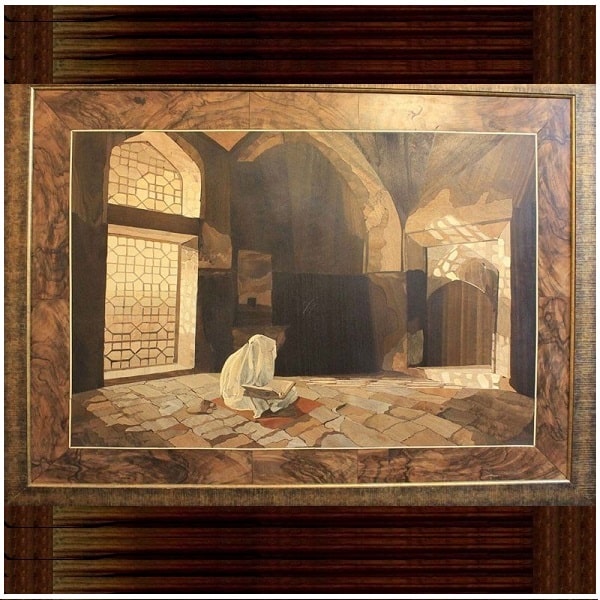Wood Inlaid (Moaraq) is the art of substitution of the different parts of a design by colored pieces of wood and integrating them with each other in order to decorate the surface of a tableau or other wooden understructures. Although the beginning of the emergence of this art is unknown, but it seems that India is the main birthplace of this art. The origin of wood inlaid working in Iran has stemmed from the art of inlaid working on tile which has emerged in the late Ilkhanid Period and after Timurid Period. Lexically Inlaid (Moaraq) means a set comprised of tiny pieces joined together to form a mechanism. In wood inlaid working, according to the delicacy and complication of the design, different pieces of wood with a high variety of colors and also shell, bone and metal are used in order to improve the quality of the manifestation of the work.